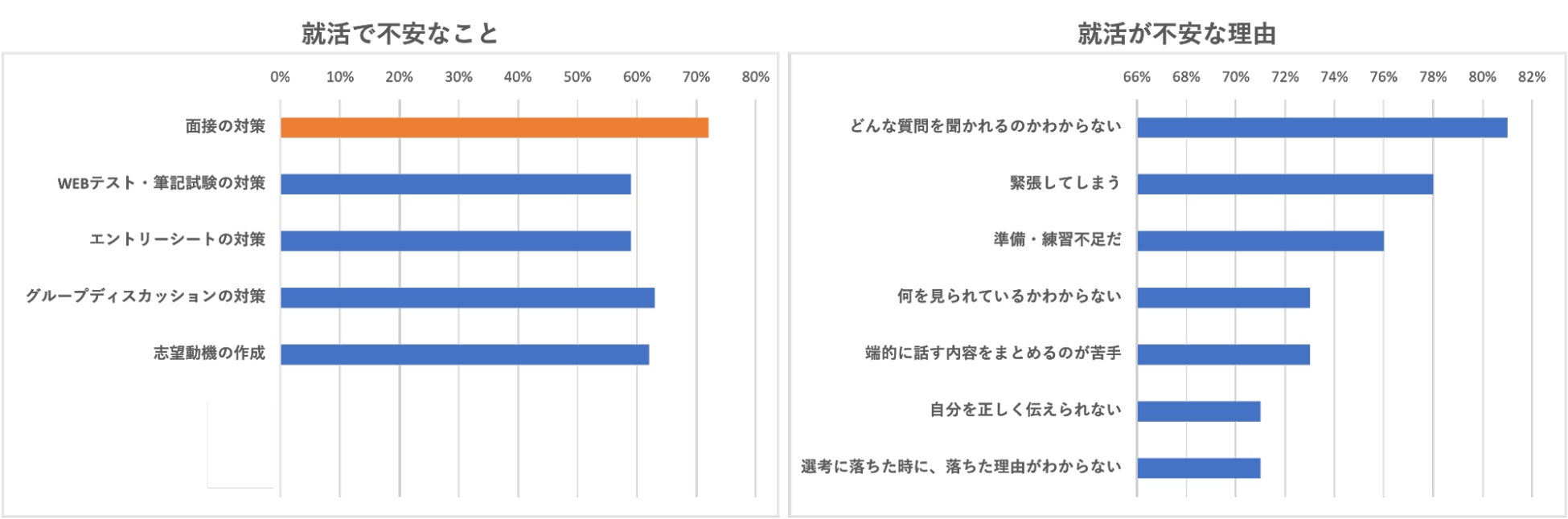 例年と比べ、課外活動において先輩から就活体験談を聞く機会も減少したため、就職活動に対する不安感が高まっていると考えられます。中でも「面接」に関しては学生と企業間においてのみ行われる密室でのコミュニケーションであるため、その内容や雰囲気について知ることは困難です。実際、「面接が不安な理由」として「どんな質問が来るのかわからない」「何を見られているかわからない」「選考に落ちたとき、落ちた理由がわからない」等が多く挙げられています。