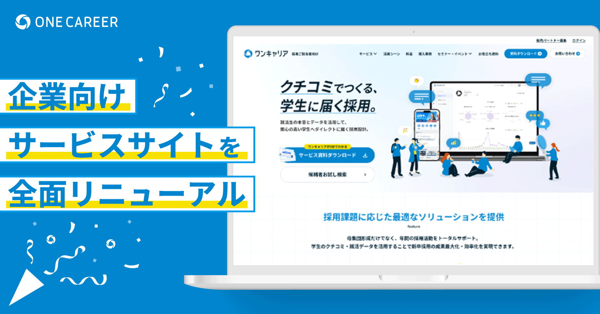 採用支援サービス「ワンキャリア」を展開する株式会社ワンキャリア(本社:東京都渋谷区、代表取締役社長 執行役員CEO:宮下 尚之、以下「ワンキャリア」)は、2025年10月28日(火)に採用支援サービス「ワンキャリア」のサービスサイトを全面リニューアルしたことをお知らせします。今回のリニューアルでは、採用課題別の導入事例コンテンツを強化したほか、サイト基盤の刷新を実施しました。今後も、企業様への情報提供を通じて、採用成功に向けた支援をより一層強化してまいります。