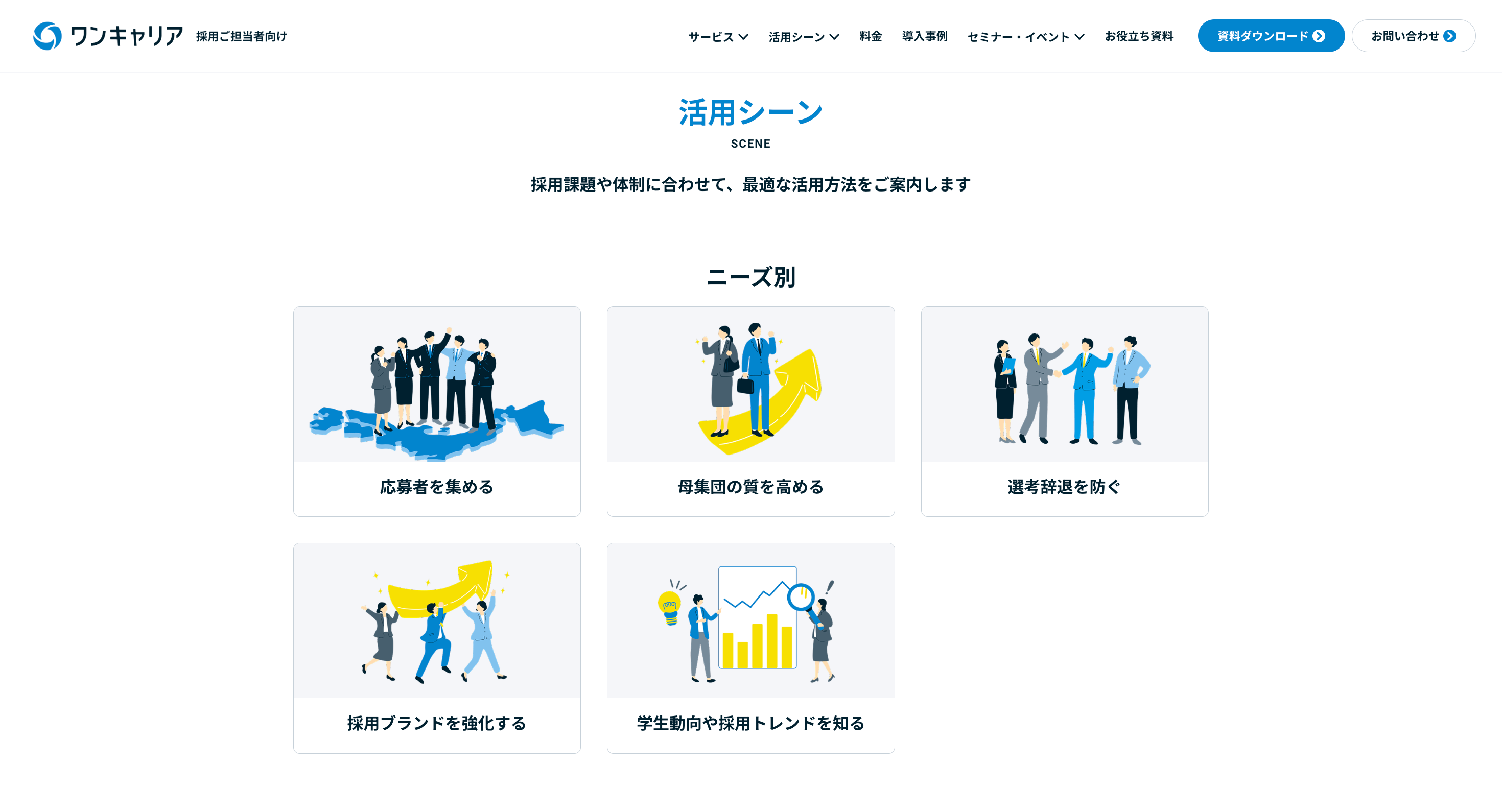リニューアル後のサイトでは、新規に採用課題別の導入事例コンテンツ「活用シーン」ページを追加しました。これにより、企業の様々な採用フェーズや課題に応じた具体的なサービス活用方法を紹介し、訪問した採用担当者様が自身の抱える課題を「自分ごと」として捉え、次のアクションへと繋がるようサポートすることが可能になります。