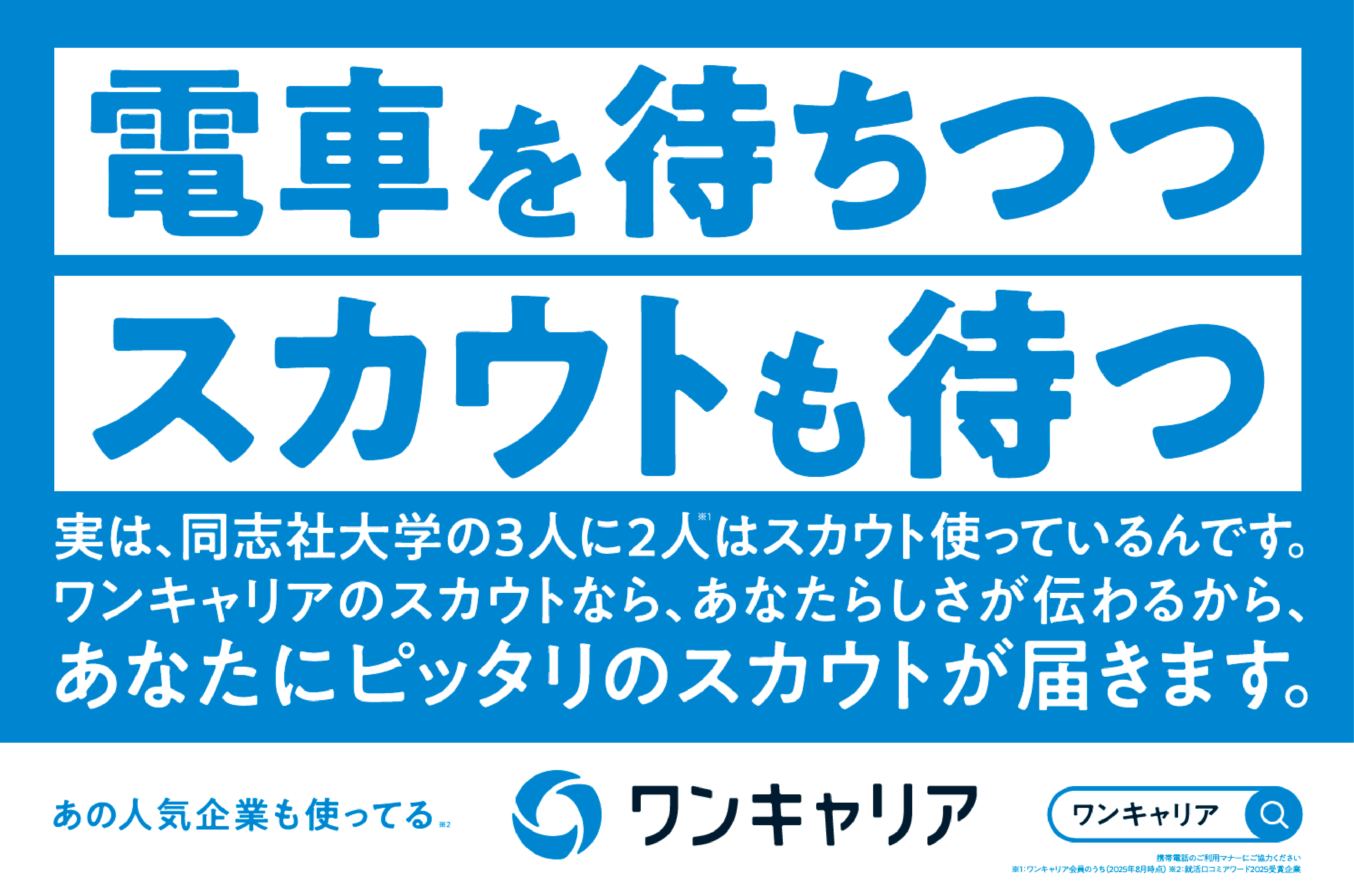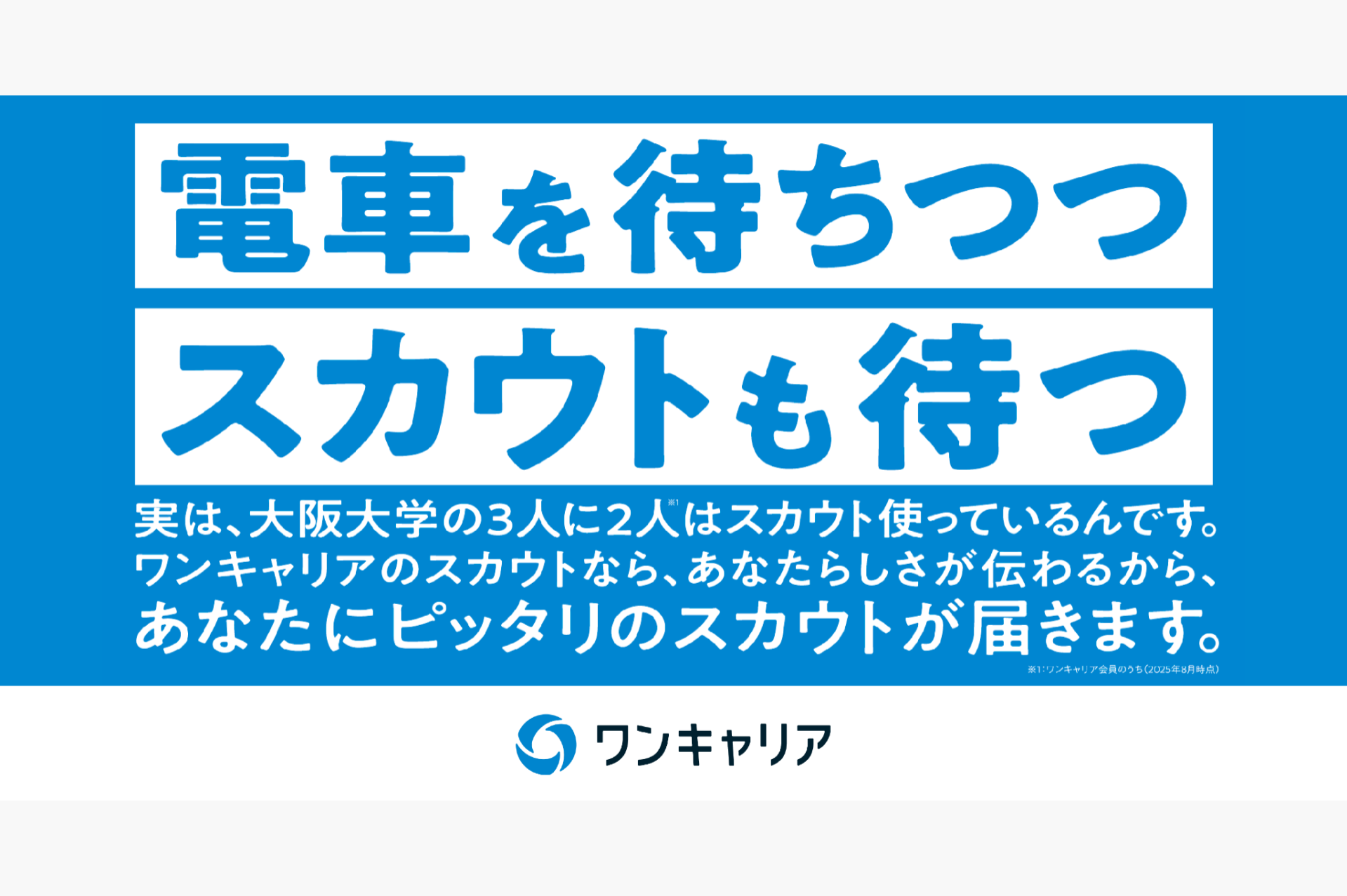 掲示駅の利用率が高い学生の大学名を記載した語りかけるようなテキスト、目に留まリやすいワンキャリアカラーである明るめのブルーをデザインに採用。「ワンキャリア」の利用により、あなたらしさを理解してくれる企業からスカウトが届き、キャリアの可能性が広がることを訴求しています。