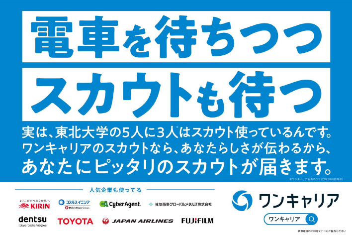 株式会社ワンキャリア(本社:東京都渋谷区、代表取締役社長 執行役員CEO:宮下 尚之、以下「ワンキャリア」)は、大学生を対象に、就活支援サービス「ワンキャリア」の認知拡大およびスカウト機能の利用者拡大を目的とした鉄道駅での屋外広告&WEB広告キャンペーンを、2025年10月1日(水)から開始します。屋外広告は、各地の大学へのアクセス拠点である15の鉄道駅に掲示されます。