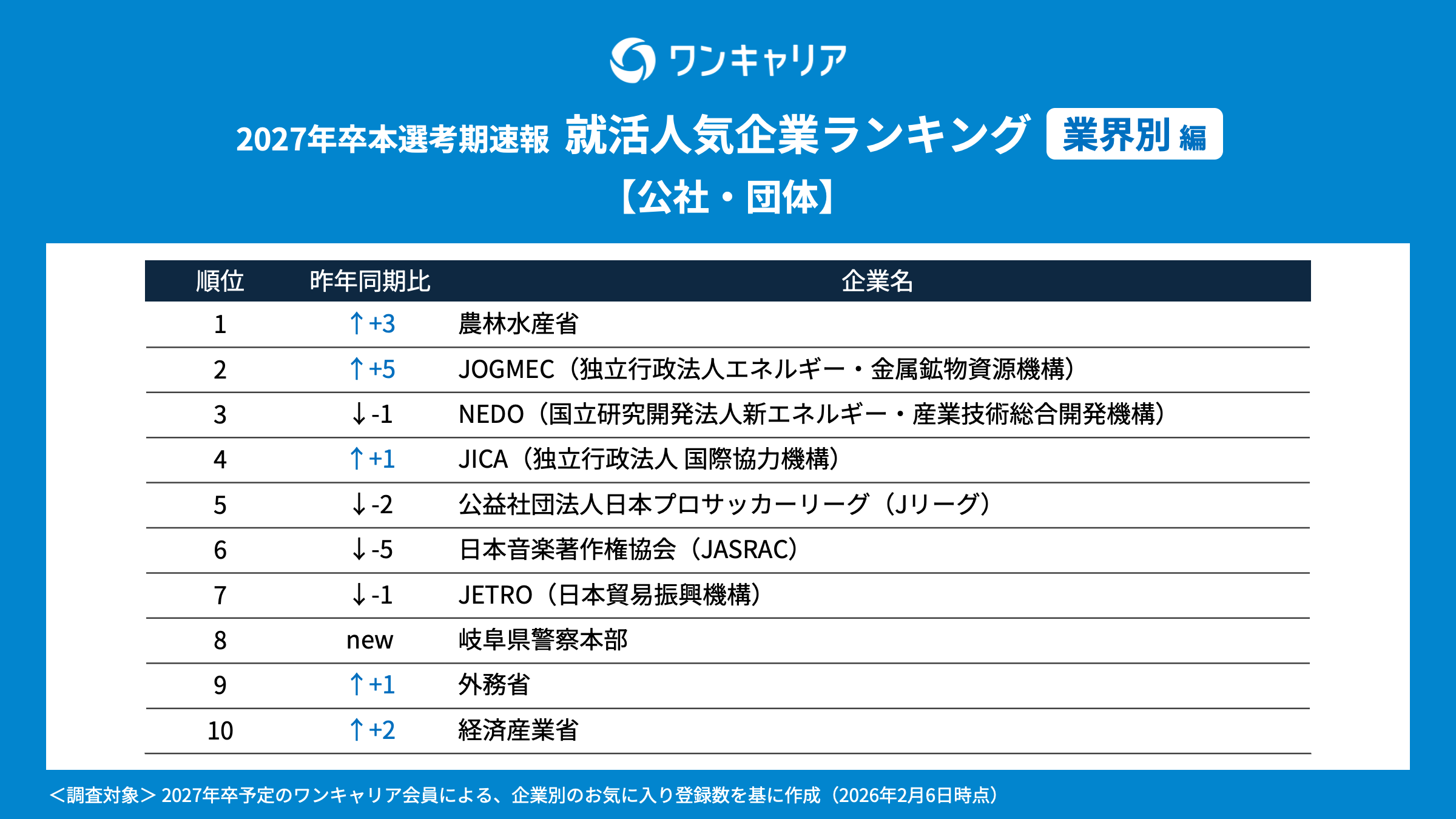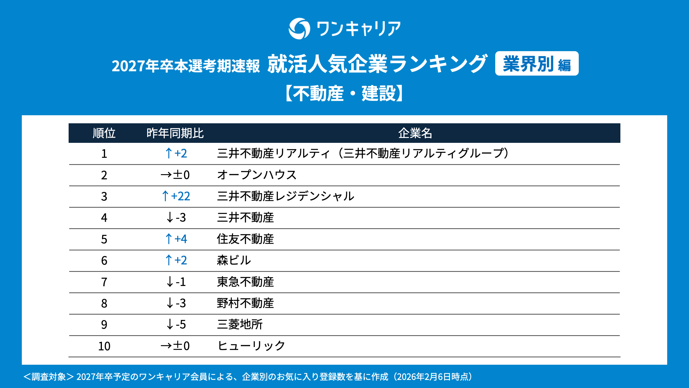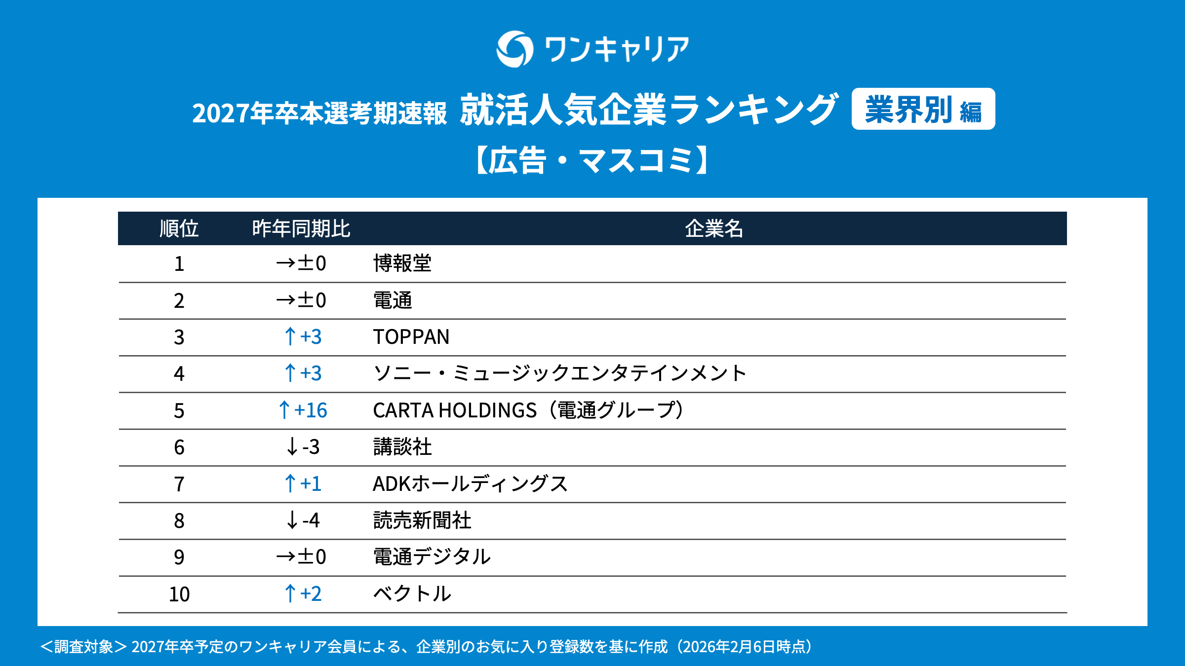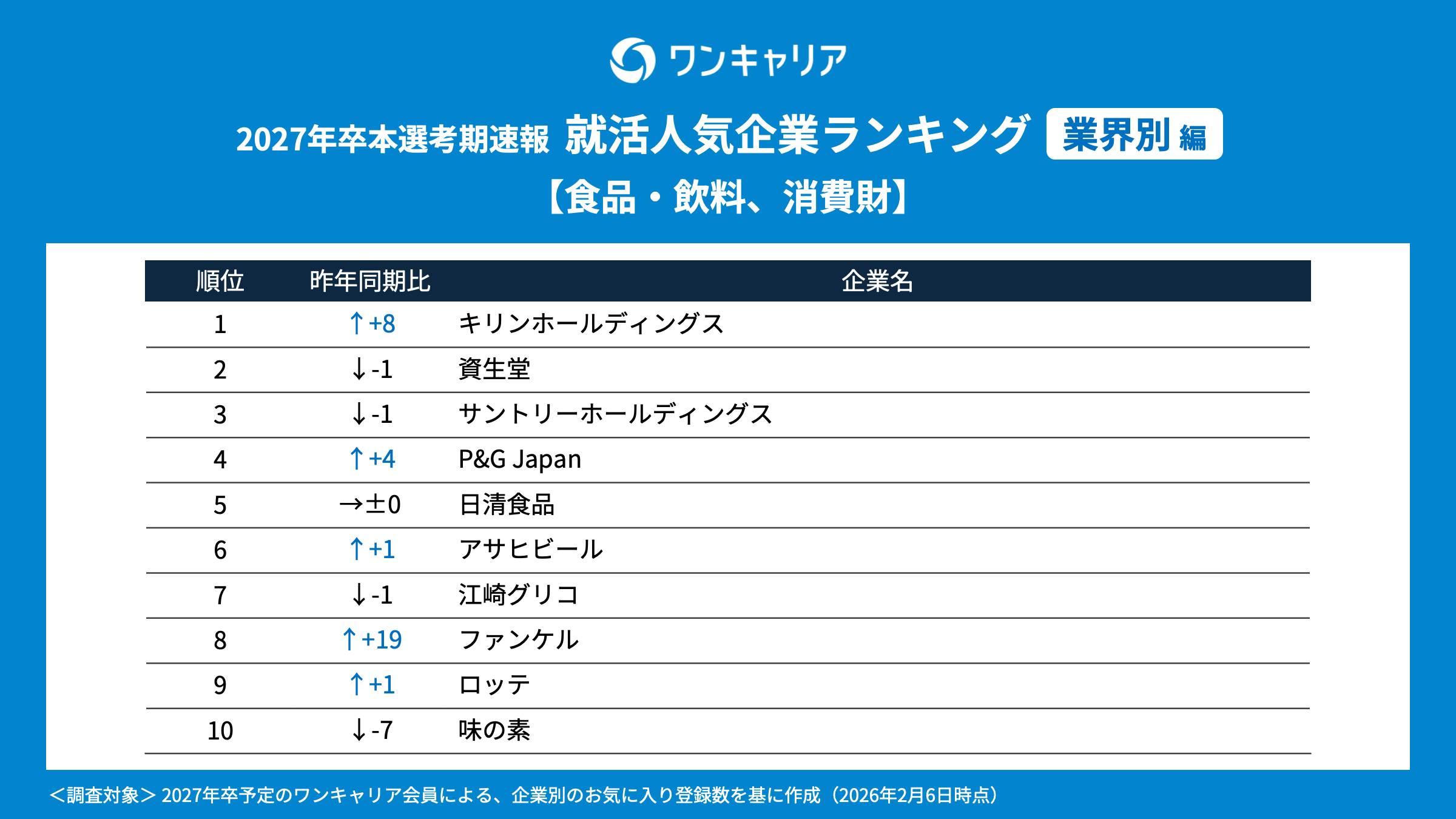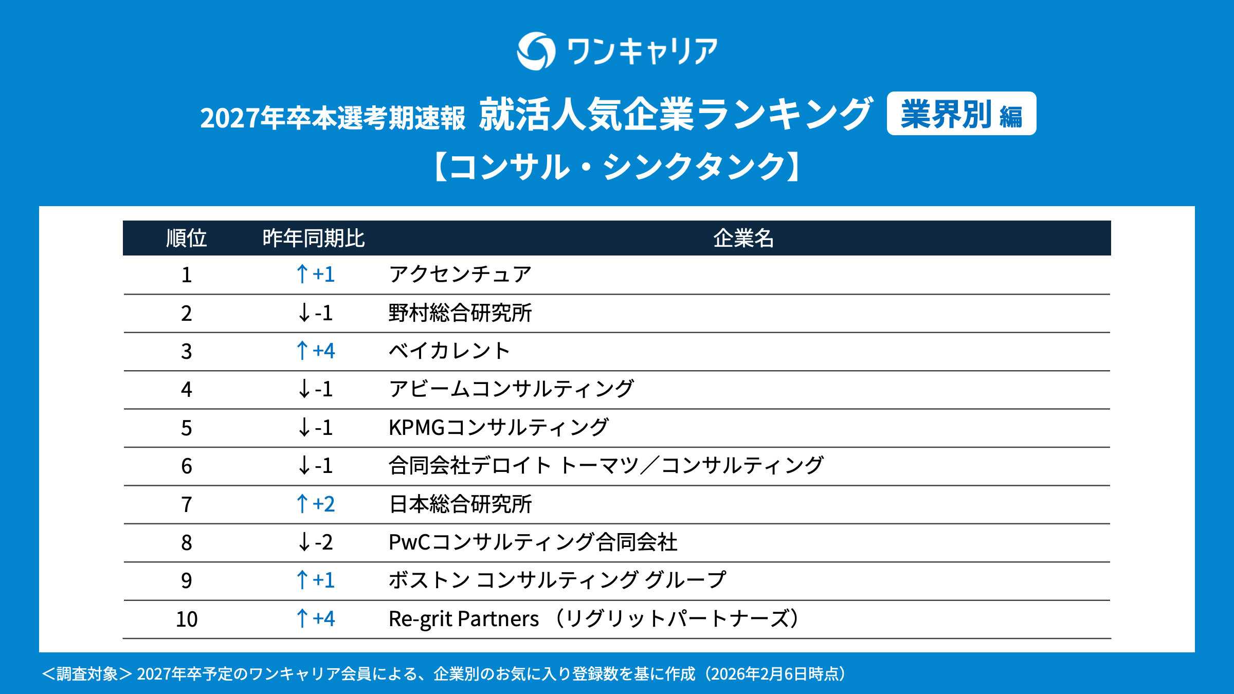 就活支援サービス「ワンキャリア」を展開する株式会社ワンキャリア(本社:東京都渋谷区、代表取締役社長 執行役員CEO:宮下 尚之、以下「ワンキャリア」)は、「ワンキャリア 就活人気企業ランキング【業界別編】(27卒本選考期速報)」を発表しました。