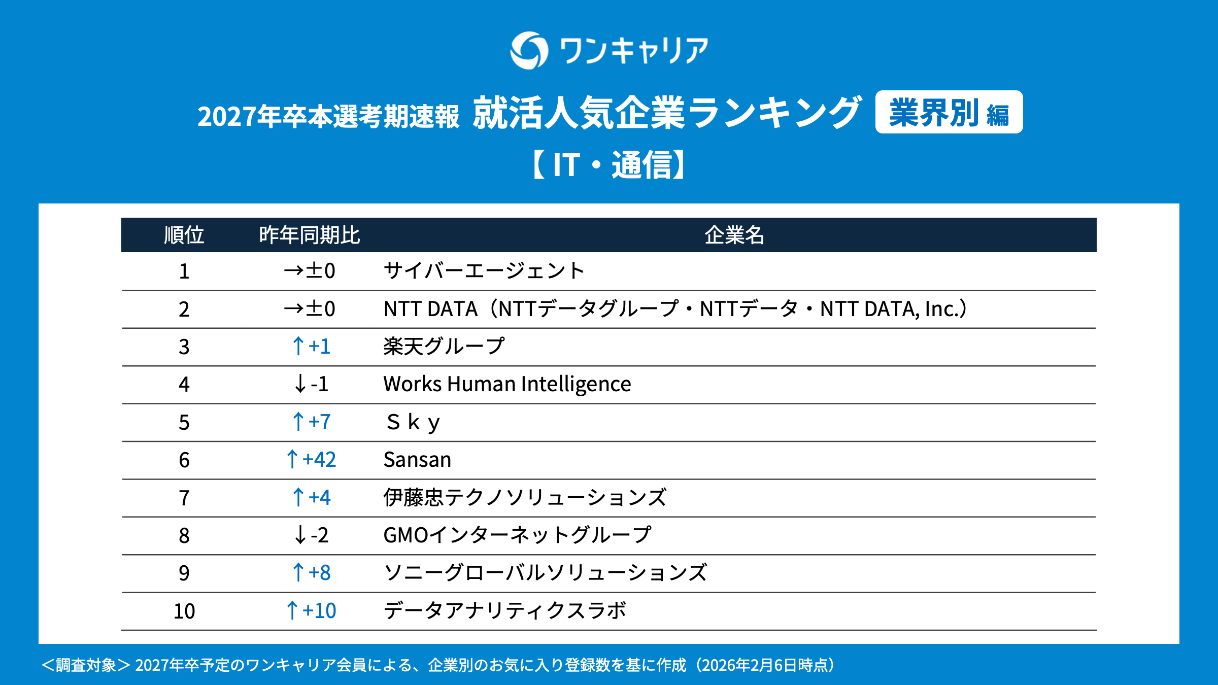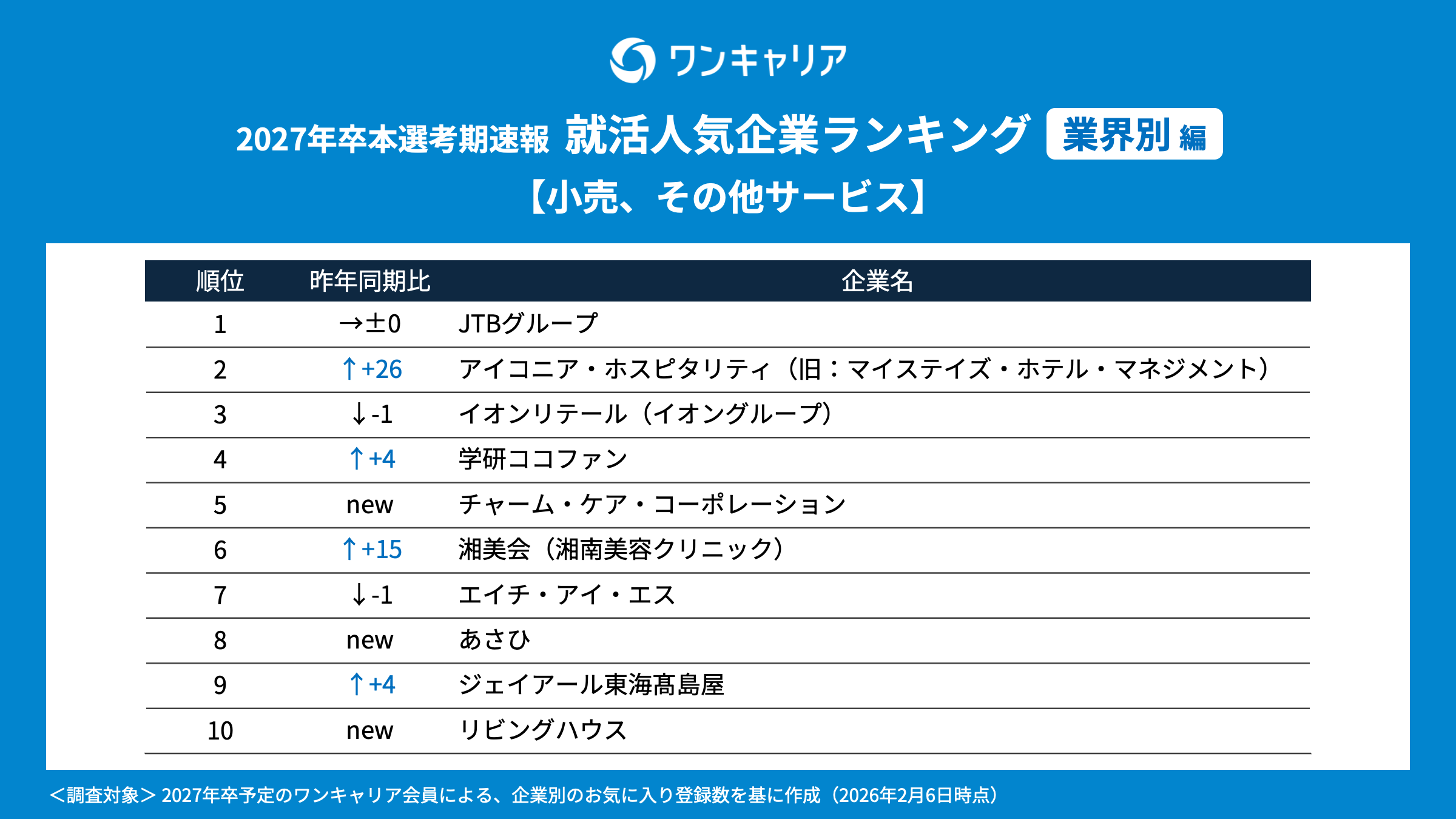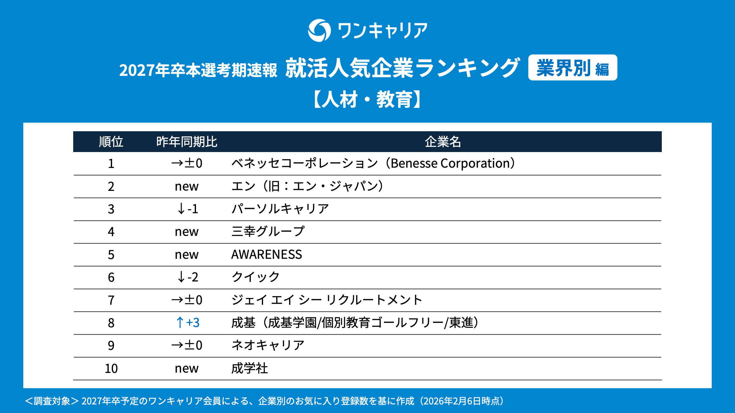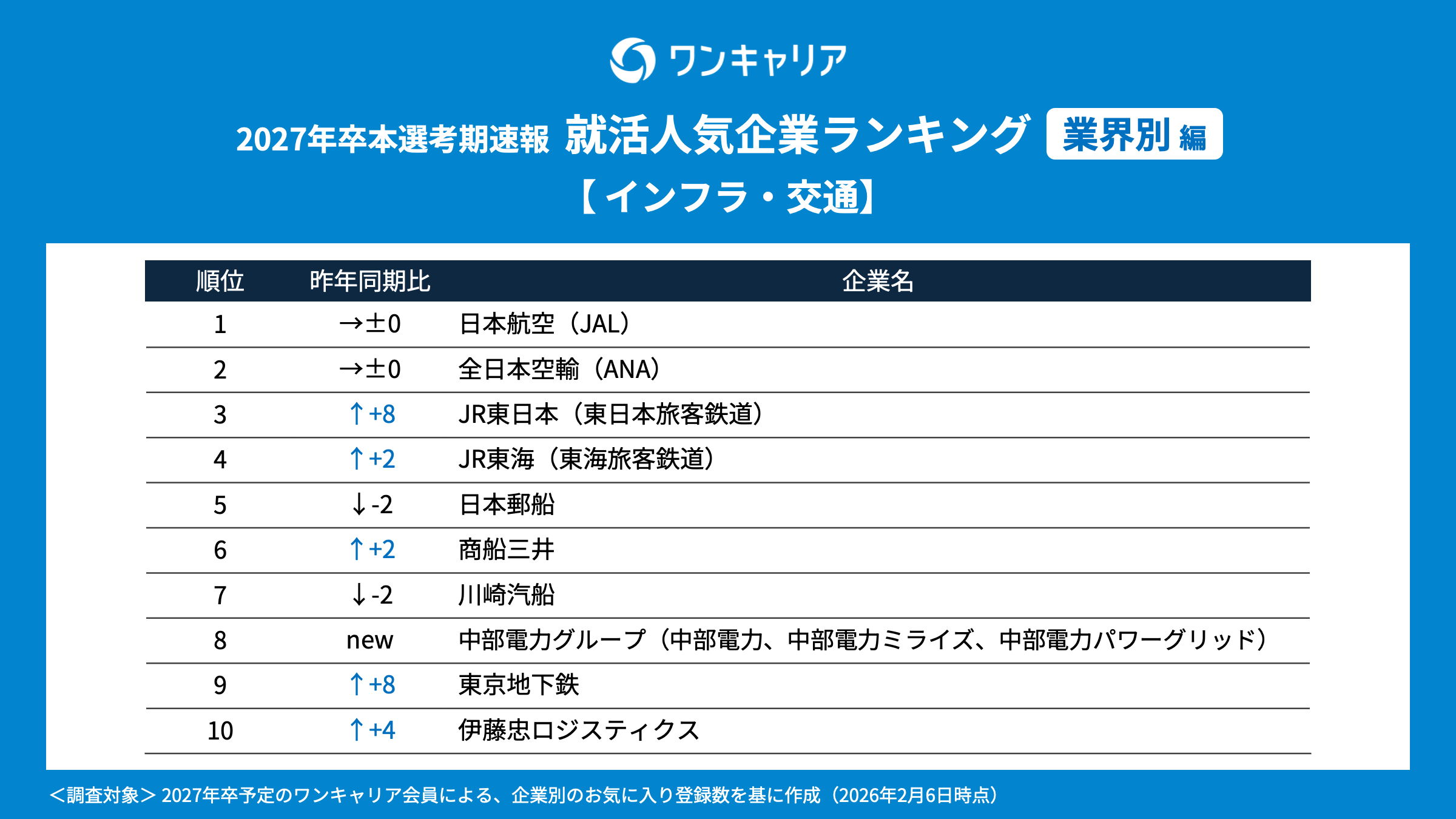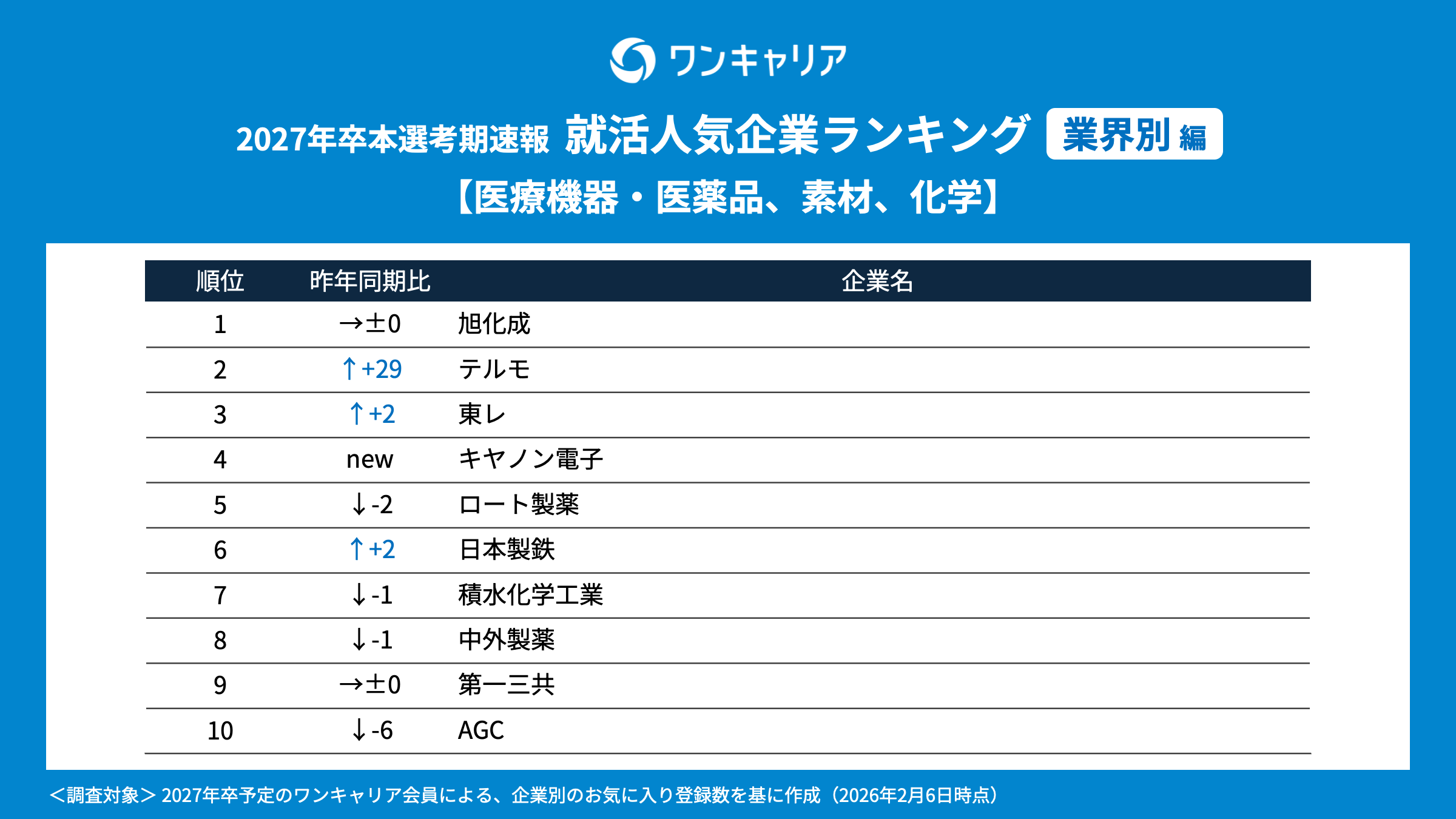 就活支援サービス「ワンキャリア」を展開する株式会社ワンキャリア(本社:東京都渋谷区、代表取締役社長 執行役員CEO:宮下 尚之、以下「ワンキャリア」)は、「ワンキャリア 就活人気企業ランキング【業界別編】(27卒本選考期速報)」を発表しました。